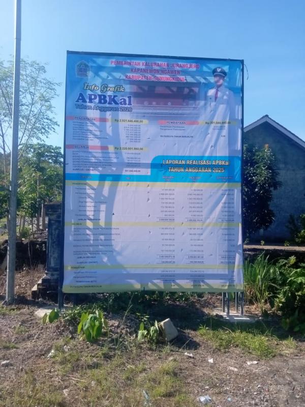 Jurangjero, 17 Maret 2026. Sebagai salah satu upaya dalam melaksanakan transparansi, akuntabilitas pengelolaan keuangan Kalurahan, Kalurahan Jurangjero melakukan publikasi Anggaran Pendapatan dan Belanja Kalurahan Tahun 2026. Mendasar pada Peraturan Kalurahan Jurangjero Nomor 8 Tahun 2025 tentang Anggaran Pendapatan dan Belanja Kalurahan Tahun Anggaran 2026 dan Laporan Pertanggungjawaban APBKal Tahun 2025. Mendasar pada Peraturan Kalurahan Jurangjero Nomor 1 Tahun 2026 tentang Laporan Pertanggungjawaban Pelaksanaan Anggaran Pendapatan dan Belanja Kalurahan Tahun Anggaran 2025.